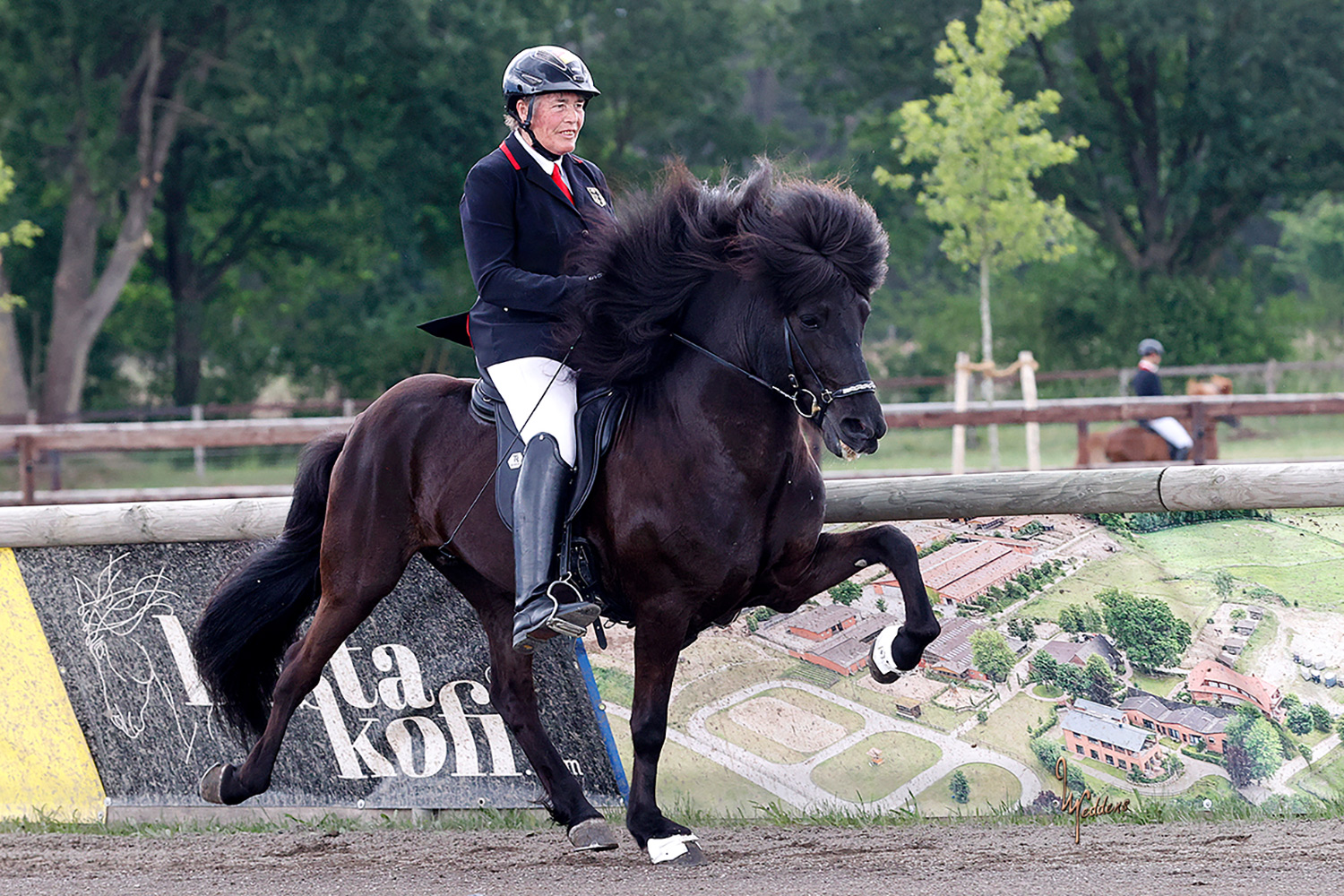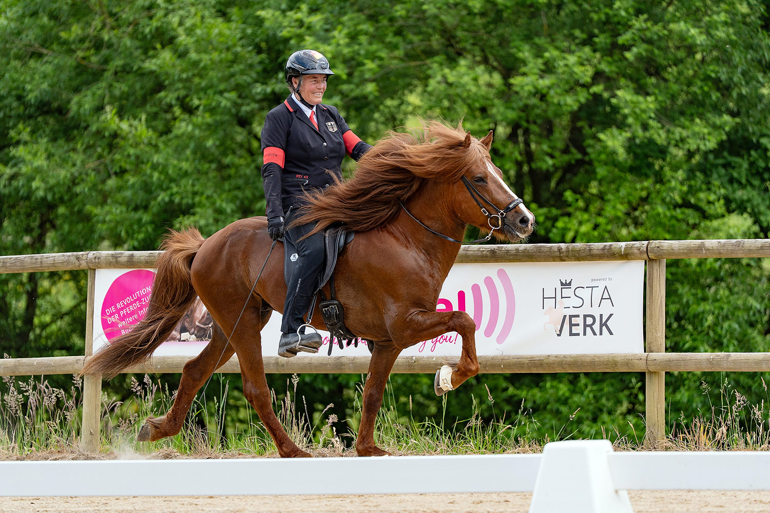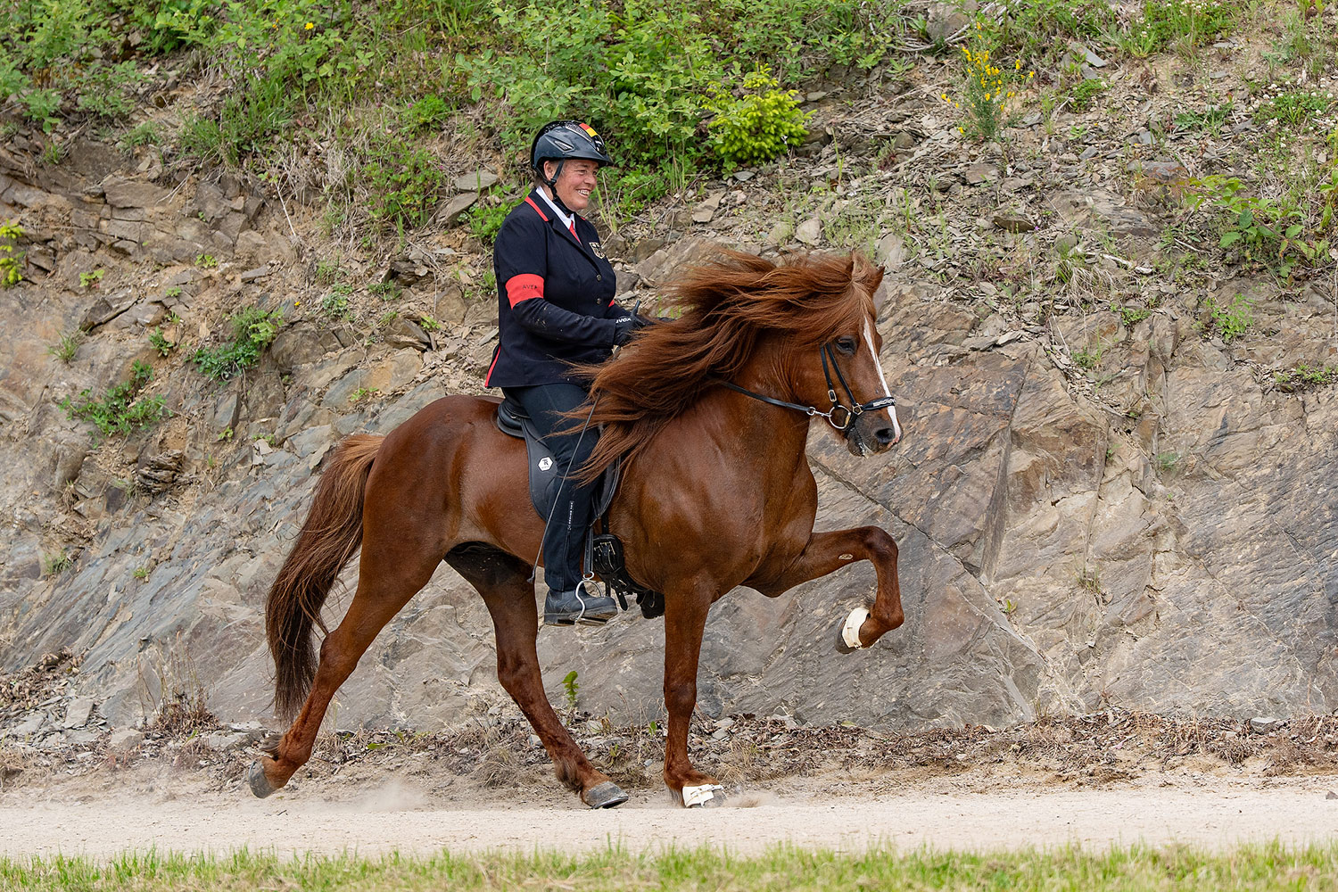 Sehr lauffreudiger, kooperativer Junghengst mit herausragendem Trab mit viel Tempo und Fluß, hochweiten, akzentuierten Bewegungen sowie fließendem Übergang in den schnellen Tölt.